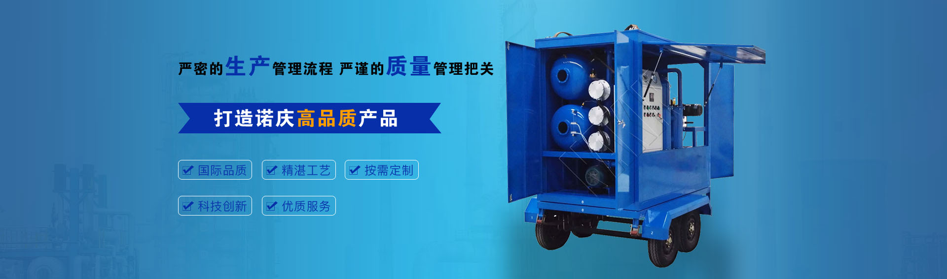 公司通過ISO9001-2015質(zhì)量管理體系認(rèn)證,CE歐盟認(rèn)證,諾慶公司所有濾油機(jī)配套產(chǎn)品均采用國內(nèi)外知名品牌,經(jīng)過多年的使用,具有質(zhì)量可靠,性能優(yōu)良。公司擁有完備的檢測儀器和檢測設(shè)備,所有產(chǎn)品出廠前經(jīng)過嚴(yán)格測試,保證每一臺產(chǎn)品合格出廠。生產(chǎn)實(shí)力雄厚